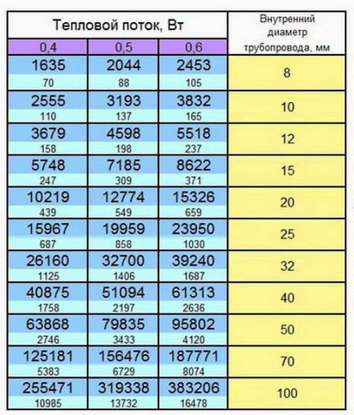 Согласно таблице, это 5518 Вт и нужно использовать трубопровод с сечением равным 12 мм, а скорость движения теплоносителя составит 0,6 м/с.