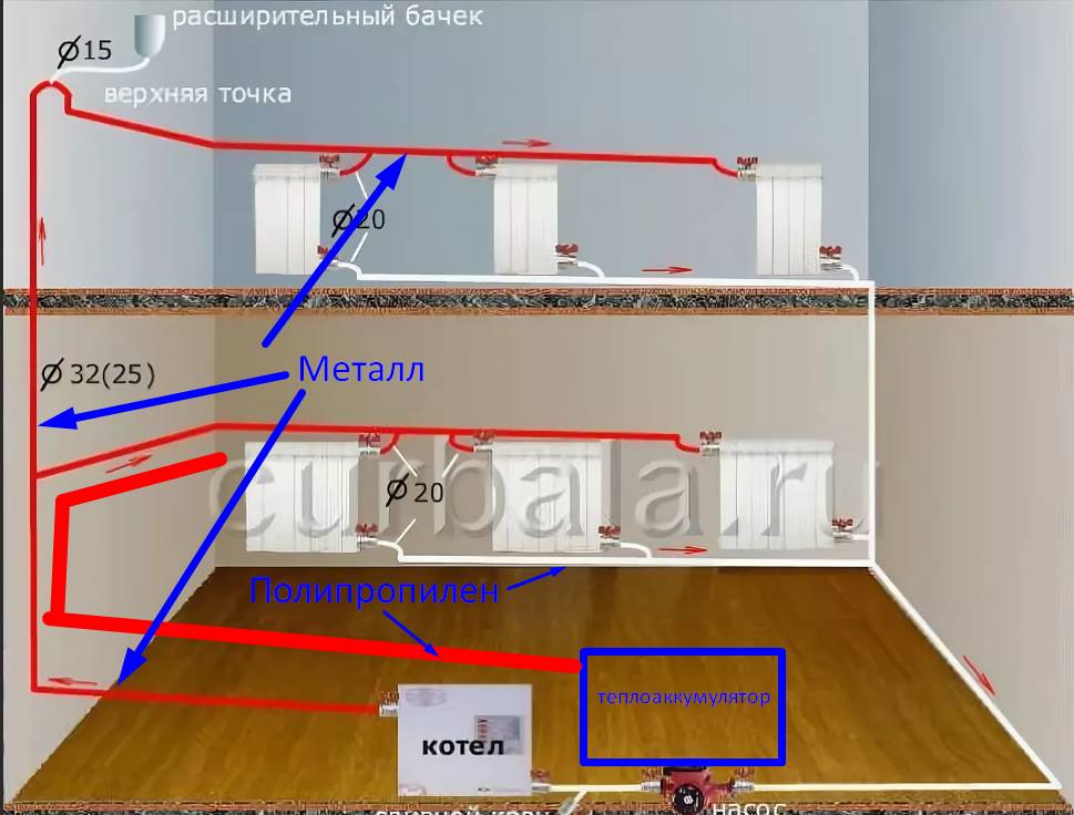 Справка! Однако если трубы разнесены, и подача заведена на чердак дома, откуда уже идут ответвления на комнаты, диаметр подающего трубопровода нужен больше обратного, для обеспечения достаточной производительности системы.