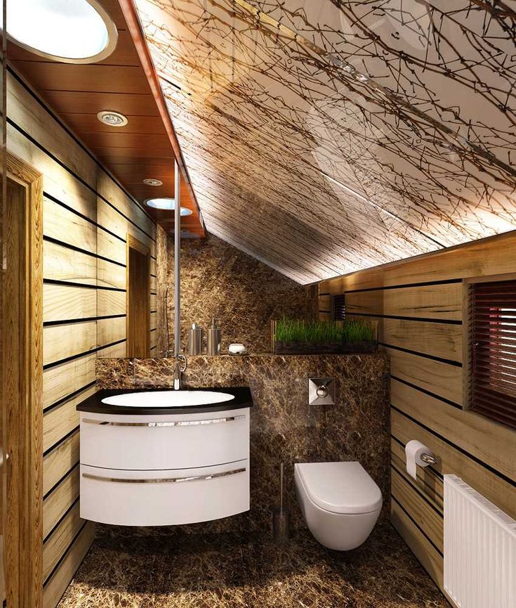 Отличным решением для просторных санузлов будет отделка деревом. Дерево выглядит невероятно красиво и дополнительно покрыто лаком, что позволяет обеспечить высокую влагостойкость.
