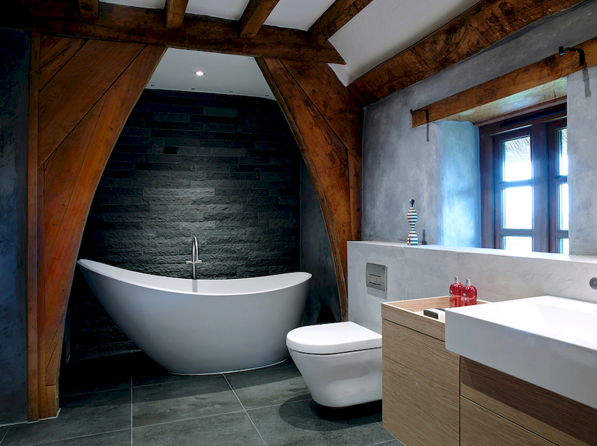 В белой ванной комнате можно поставить черную ванную и добавить немного дерева в интерьер