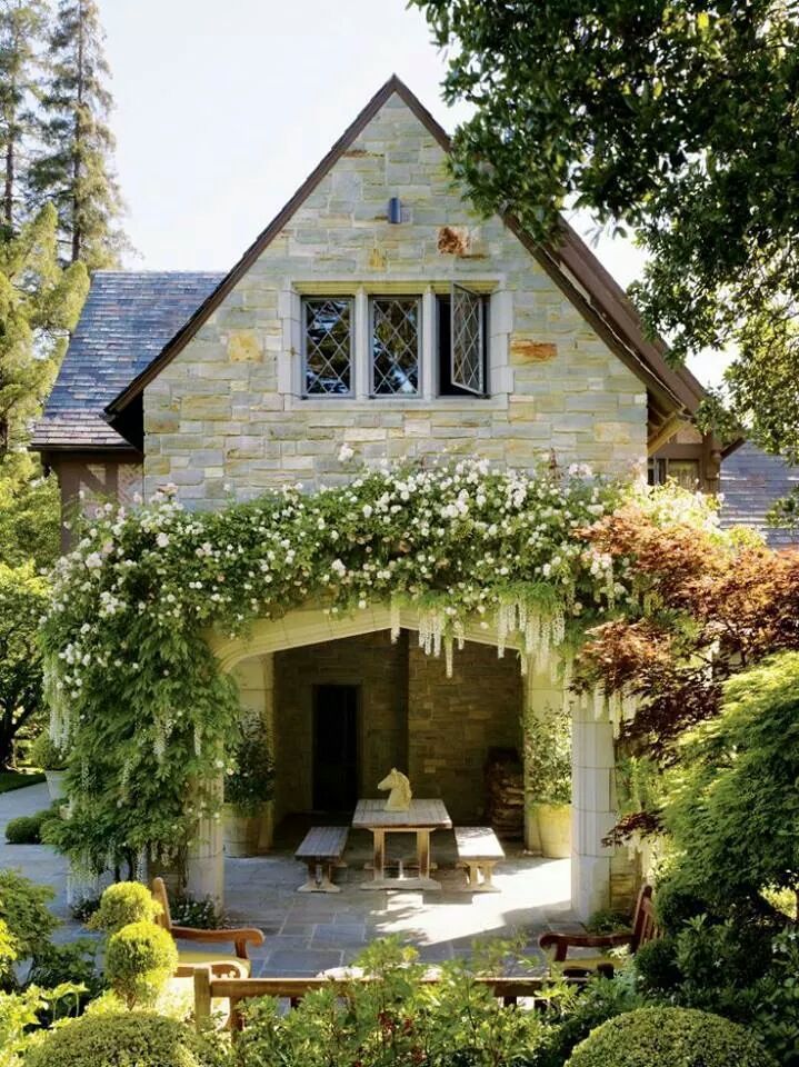 Ещё одним стилевым элементом может выступить кованая калитка или небольшая железная арка. Кованые предметы смотрятся строго, но в то же время удачно сочетаются со светлыми стенами и обилием зелени вокруг.
