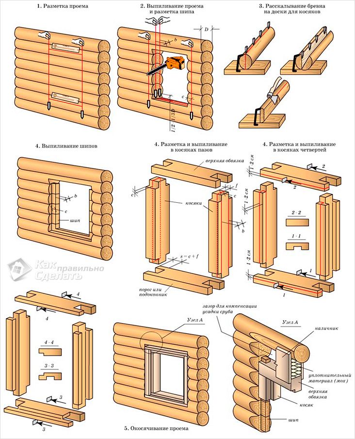 Ещё этот способ называется «в колоду». Используется веками. Известен своей крепостью, надёжностью. Однако является самым трудозатратным и дорогостоящим. Торцы проёма обрабатываются так, чтобы создать шипы, на которые будет крепиться короб. Боковые части оформляются пазами. Верхняя часть к боковым колодам фиксируется на саморезах, а порог или подоконник закрепляются нагелями. Обычно этот способ встречается в рубленых деревянных домах, при использовании оцилиндрованного бревна.