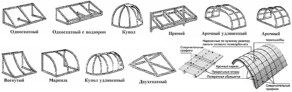 Покрытием обычно служит поликарбонат, полиэтиленовая пленка или нетканый материал. Фундамент – вариативно, в зависимости от того, будет использование круглогодичным или только летним.