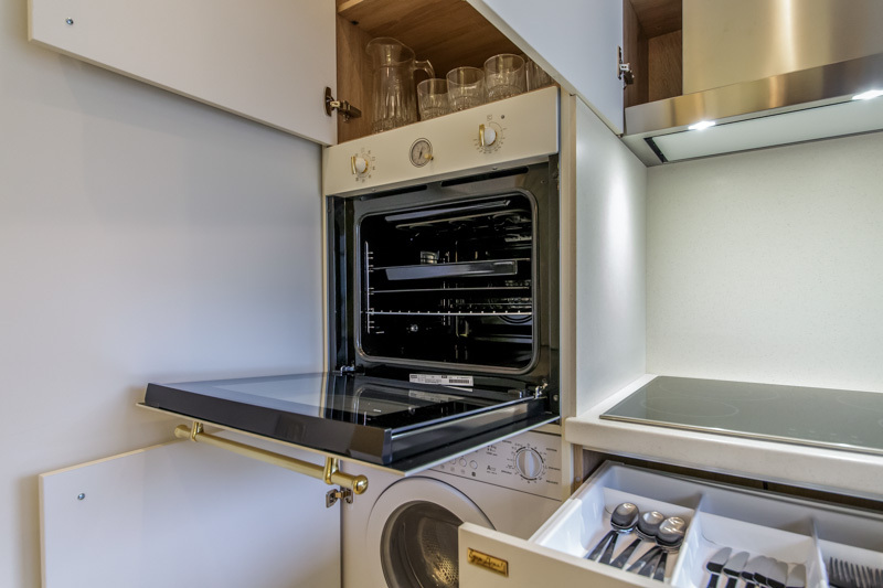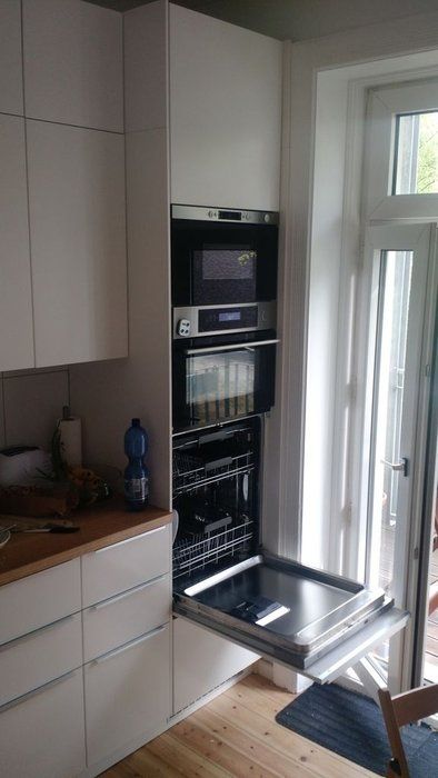 Установка производится в обычный шкаф-пенал. Внизу располагается посудомойка, вверху — духовка (или любая другая бытовая техника). Такой способ размещения техники позволяет сэкономить 50–90 см пространства.
