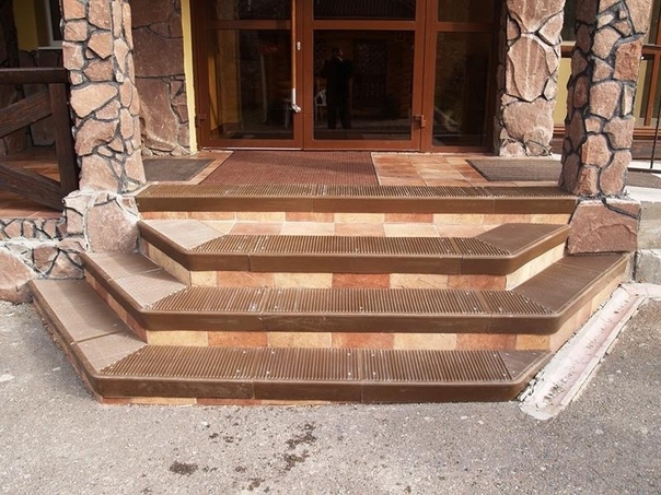 Ассортимент этого материала позволяет подобрать как однотонные гладкие, так и рельефные или узорчатые плоскости. Замостив этим же материалом дорожку и поверхность земли вокруг крыльца, получают завершенный изысканный вид.