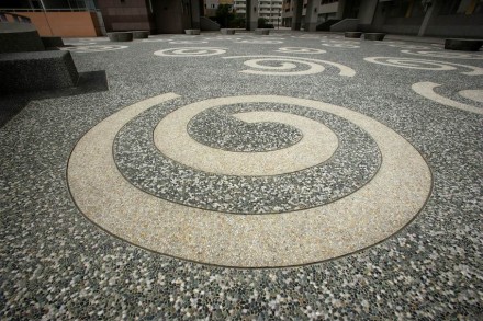 - Дизайн каменного ковра очень разнообразен. Вы можете комбинировать его с крупной каменной плиткой, создавать изумительные мозаики или использовать разноцветную гальку и создавать сложные узоры.
