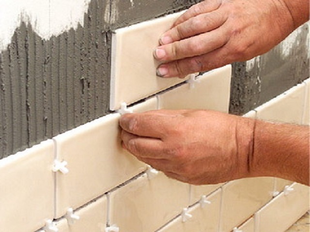 Если он уже начал немного схватываться, его использование завершается. - Подготовленная плитка прижимается к стене с определенным усилием, прижимается до тех пор, пока не будет достигнута необходимая плотность прилегания (примерно 2мм от стены).