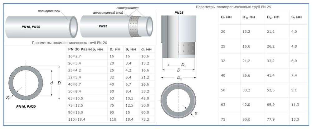- PN20 и PN25. Трубы рассчитаны на давление до 20 и 25 атмосфер соответственно. Используются в монтаже систем отопления и ГВС. Трубы, армированные стекловолокном, используются при температурах транспортируемой среды до +95 °С, для подачи холодной и питьевой воды повышенного давления, для теплых полов, горячей питьевой и производственной воды, для транспортировки и хранения сжатого воздуха, химических веществ и промышленных распределительных сетях.