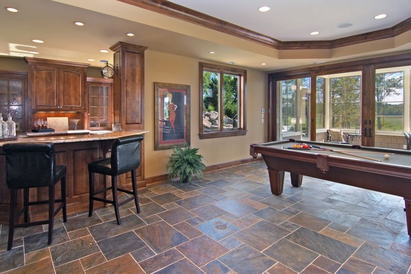 Полы из пиленого камня, хотя и имеют грубую рельефную фактуру, достаточно привлекательно выглядят. Они не имеют изысканного блеска, изящной матовости, но, между тем, являются украшением практически любого жилого помещения. Ведь красивая текстура, особенная окраска натурального камня сохраняется. Пиленые полы красивы в интерьере рабочего кабинета, холла, помещения для гостей, большой столовой.