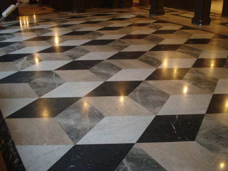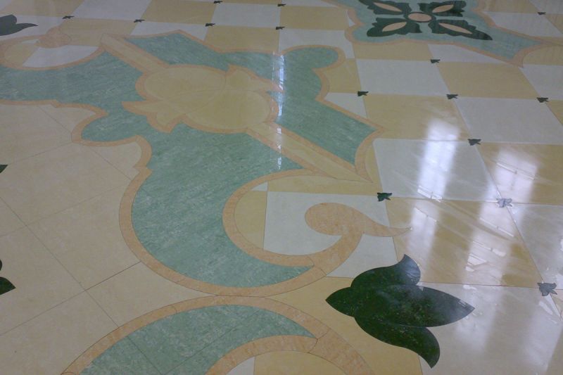 Восстановление пола, отделанного камнем разной твердости — пожалуй, самый трудный случай. Поскольку современные нормы не допускают облицовку пола камнем с неодинаковыми показателями твердости, такие полы обычно встречаются в старых домах и, как правило, характеризуются неравномерным износом облицовочных элементов. Каменный пол, находящийся в таком состоянии, требует выравнивания, но перед тем, как приступить к этой операции, мастера определяют, какой камень преобладает в облицовке — твердый или мягкий. Если основу облицовки составляет, например, мрамор, а гранита всего 10%, то гранитные элементы отделяют от основания пола и углубляют посадочные окошки. Затем детали гранитной облицовки укладывают так, чтобы их поверхность находилась на уровне максимального износа мраморных плит. Так поступают для того, чтобы более изношенный мрамор сошлифовать вровень с гранитом. Это кропотливая и дорогая работа, позволяющая, однако, добиться впечатляющих результатов.