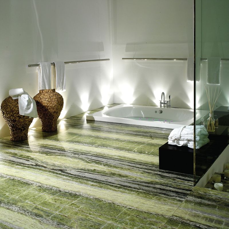 Визуальная схожесть такого пола с покрытием из камня делает его «натуральным». Для оформления полов используется мраморная крошка или мраморная полированная плитка с немного шероховатой поверхностью, чтобы не возникало эффекта скольжения. Такой пол прекрасно подходит для ванной или бассейна.
