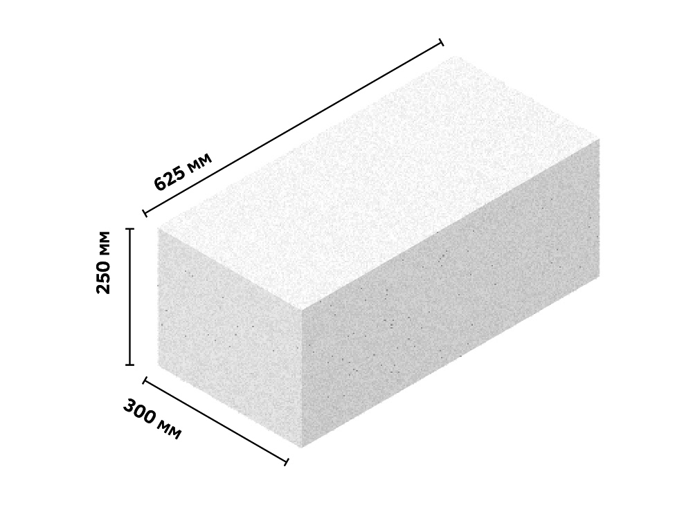 Объемный вес газоблоков различных марок колеблется от 300 до 1200 кг/ м?. В малоэтажном строительстве обычно используют газоблок с объемным весом 400 до 600 кг/м?. Прочность газоблока — 10-50 кг/см?, коэффициент теплопроводности — 0,09-0,14 Вт·м°ree;С. Допустимые отклонения геометрических параметров граней +/- 1 мм.