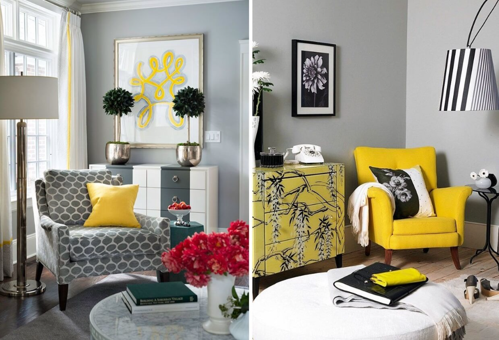 - серый + желтый наполняют комнату теплом, поднимают настроение