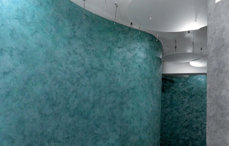 Венецианка может представлять собой имитацию гранита, мрамора, травертина или других каменных фактур. Ее наносят слоями и довольно часто покрывают воском, что позволяет создать, не только дополнительную защиту от воды, но и за счет полученной глянцевой фактуры и плавных переливов, придать поверхности особой утонченности и роскошности.