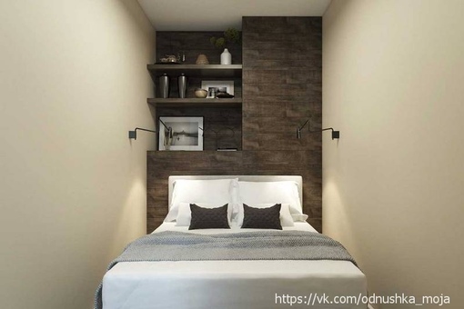 В спальне размера мини не стоит размещать большое количество разнообразной мебели. Вполне достаточно будет кровати и пары мест для хранения вещей. Неплохо в таком пространстве будут смотреться небольшие полочки или большие элементы декора.