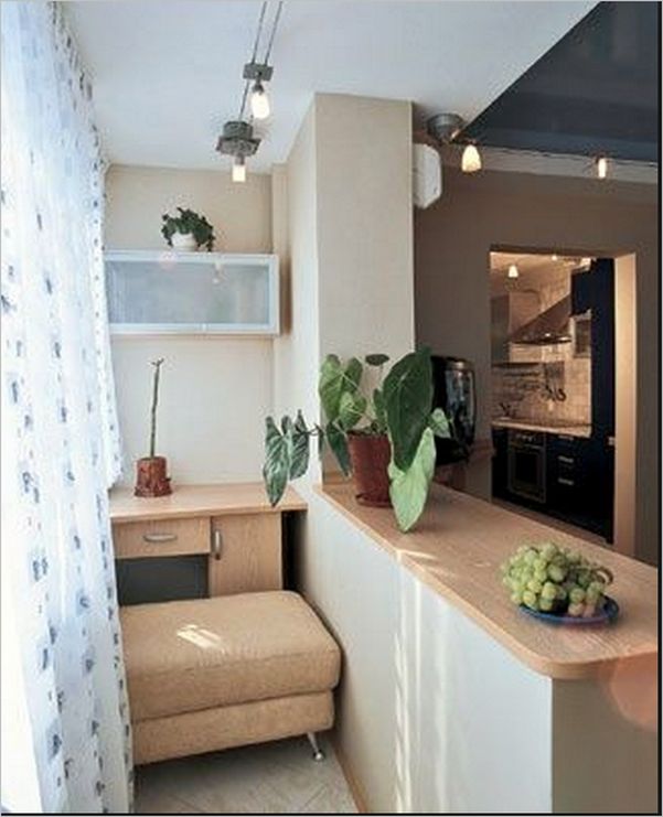Лучше соединять не с балконом, а с лоджией – она дает больше возможностей. Балкон не выдержит большую нагрузку, поэтому подобные перестройки требуют обязательного согласия сотрудников БТИ. В остальном придерживаются личных пожеланий.