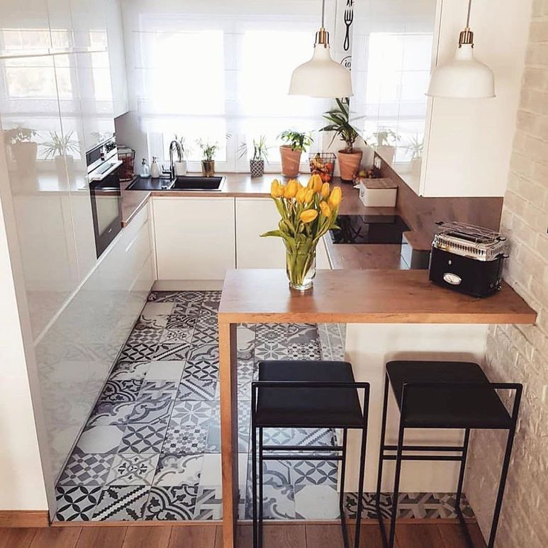 Для кухни в 7 квадратов оптимально подойдут светлые стены и пол. Они могут быть одинакового цвета или пол немного темнее. Из материалов наиболее долговечным и практичным является керамическая плитка. Ее цветовое и стилистическое многообразие позволит подобрать то, что нужно.