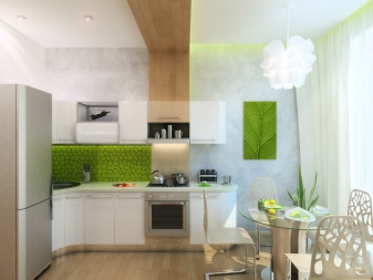 Осуществлять зонирование между кухней и жилой зоной лучше всего за счет контраста цветов и фактур отделки. Разноуровневый потолок или пол могут зрительно уменьшать и без того маленькое помещение. Однако потолок можно использовать как дополнительное пространство для хранения.