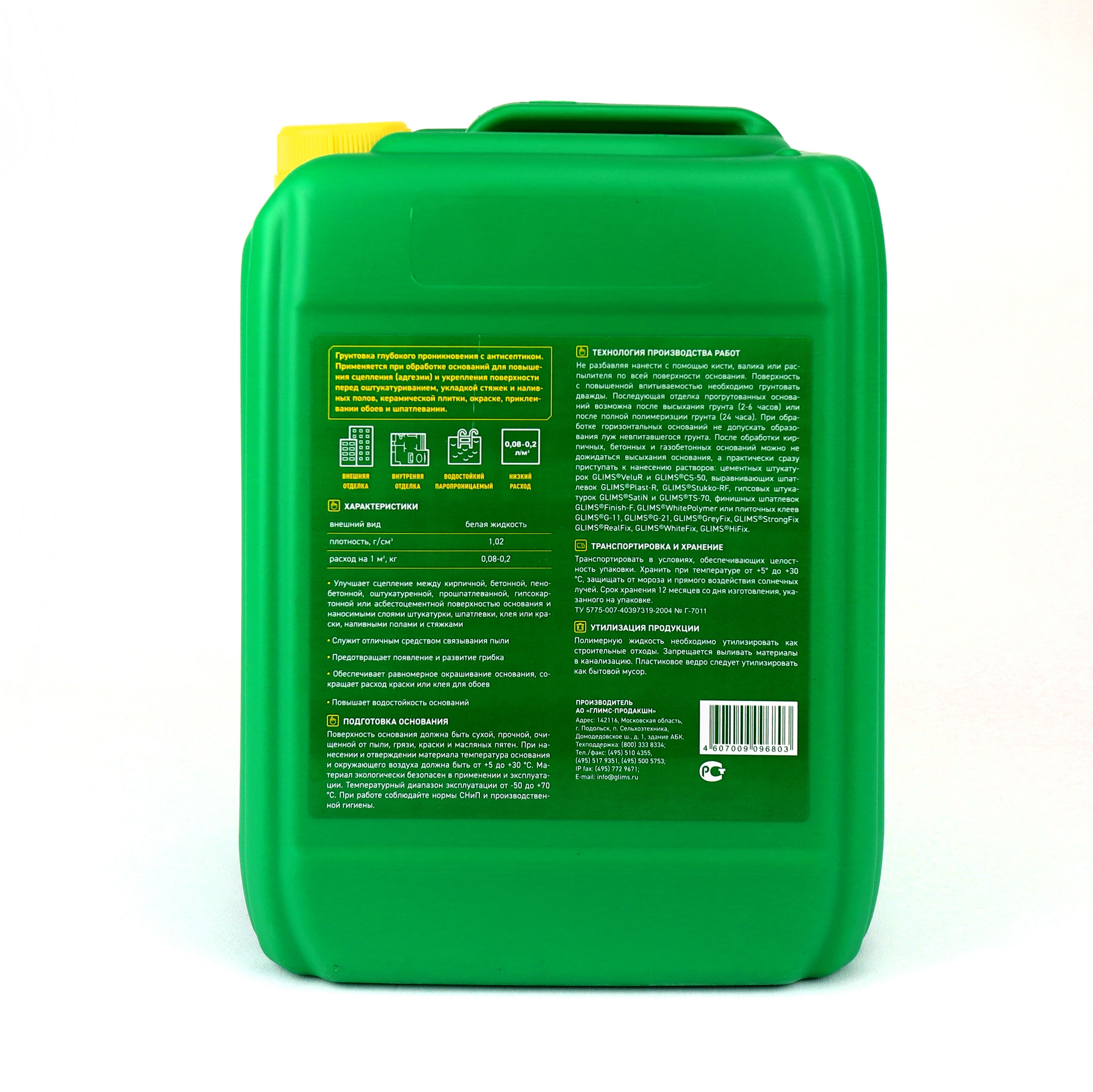 Грунт содержит нелетучий остаток на уровне 15 — 20% от общей массы, остальное — растворитель (вода). Пленка образуется за 30 – 40 минут, а полностью материал высыхает за 3 – 6 часов. Лучше всего грунтовка сохнет при комнатной температуре и влажности 40-60%.