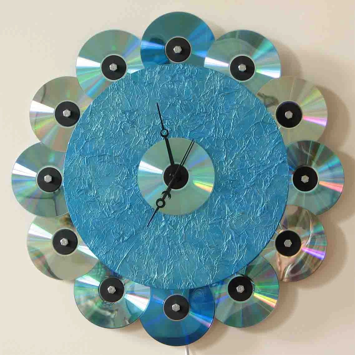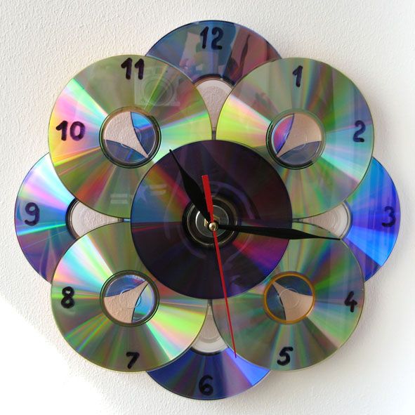 Часы, выполненные из старых CD, станут прекрасным дополнением для современных интерьеров. Вы можете сделать миниатюрный вариант из одного диска или более массивный, если скрепить несколько дисков между собой. Для этих целей можно использовать обычный стойкий клей или двусторонний скотч.
