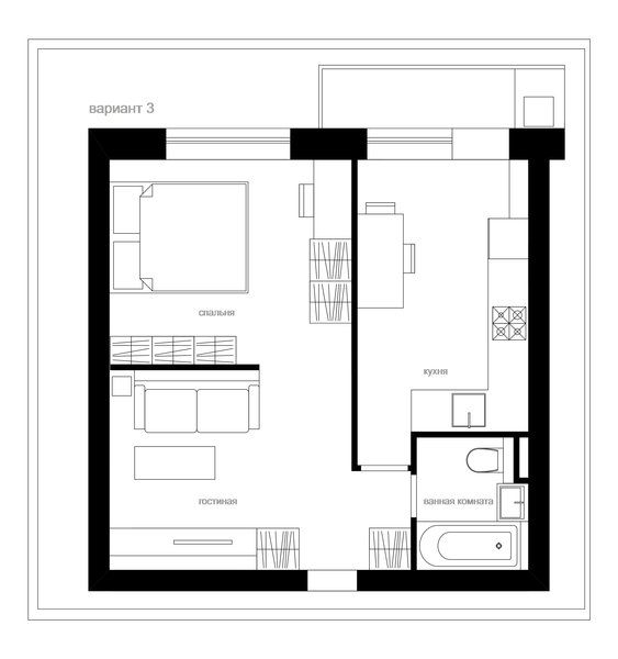 СОВЕТ: если у вас получается спальня без окон, отметьте ее на плане как гардеробную. В противном случае БТИ не даст вам «добро» на перепланировку. Вот еще любопытные варианты обустройства однокомнатной квартиры.