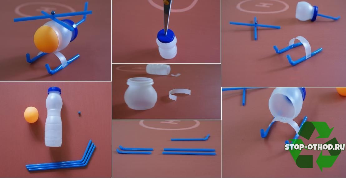 Вертолет собирают из маленькой бутылочки, нескольких пластиковых трубочек и шарика для пинг-понга. Собрать такую поделку из бросового материала можно очень быстро, а затем раскрасить на свое усмотрение. Лопасти склеивают друг с другом, а полозья крепят на степлер.