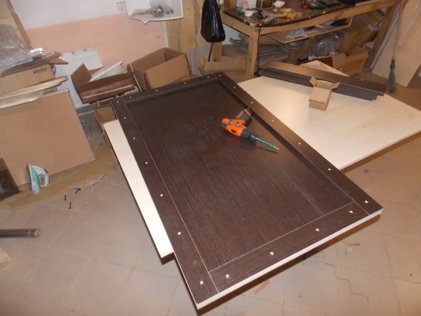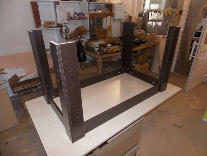 - Прикрутите ножки к верхней части стола с помощью саморезов.