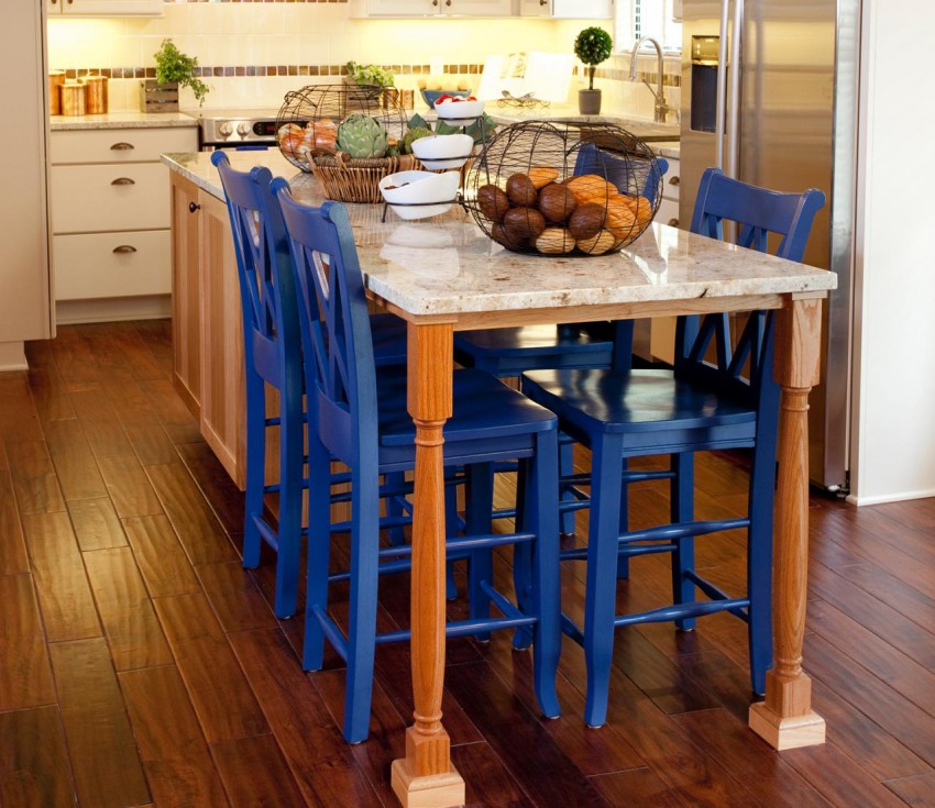 Чаще всего при сборке кухонного стола используются мебельный щит и ЛДСП (ламинированная древесностружечная плита). Главным достоинством первого варианта является простота в работе. В продаже встречается щит из сосны, который легко сверлится и шлифуется. Для работы с ним не потребуется мастерская – собрать стол можно будет прямо дома. У мебели из щита есть и недостатки. Ее приходится шлифовать до ровной поверхности и дополнительно обрабатывать защитными покрытиями – пропиткой и лаком.