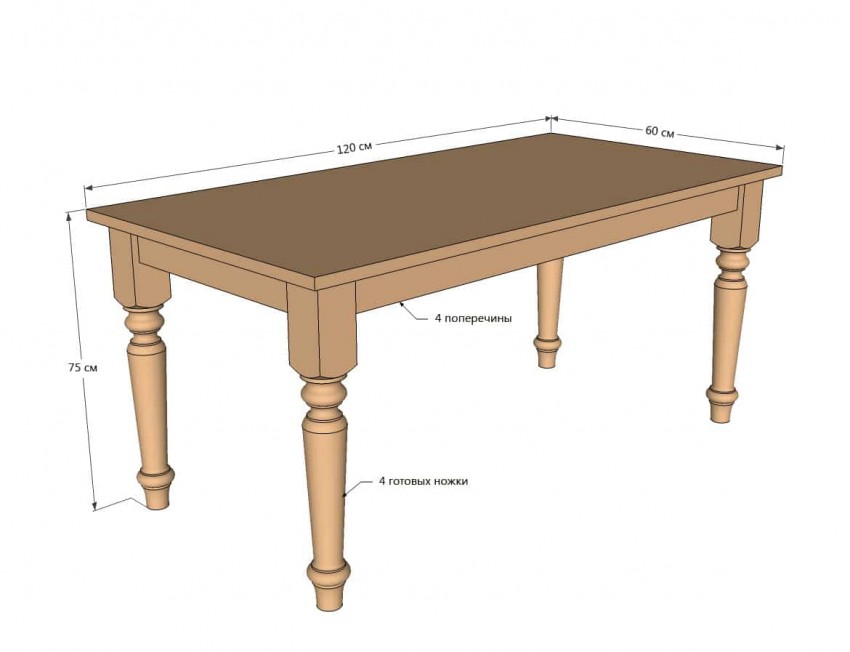 В первую очередь необходимо определиться с габаритами стола, его дизайном, затем самому составить чертеж будущего изделия. Если помещение малогабаритное, подойдет небольшой столик на 3–4 персоны. Для просторной столовой зоны можно смастерить большой обеденный вариант на 8 пользователей и более.