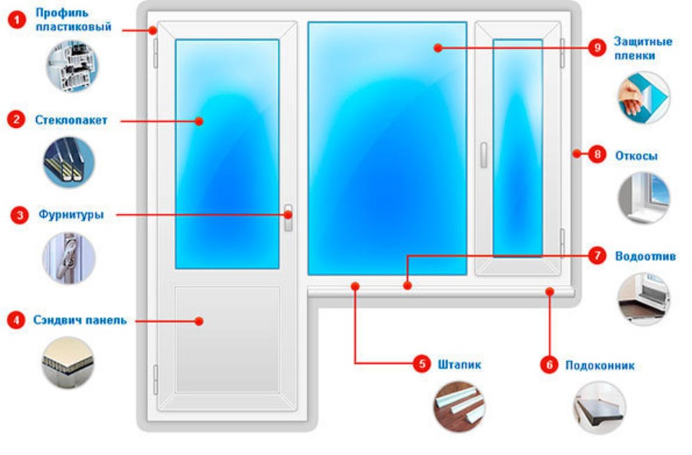 Перед тем как начинать выбирать, какие пластиковые окна лучше, следует познакомиться с их конструкцией. Состоят такие конструкции из следующих элементов:
