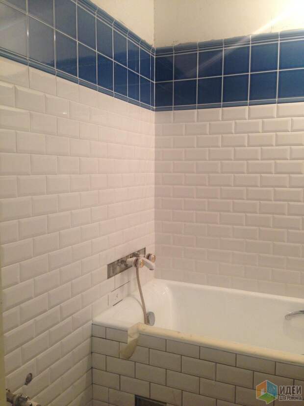 На фото настенная белая плиточная отделка с фугой синего цвета.