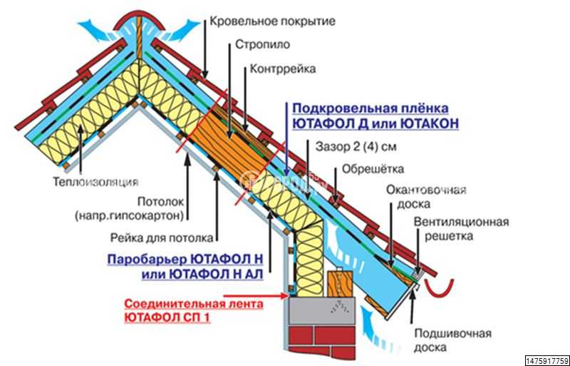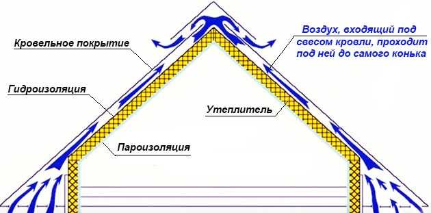У пара очень высокая проникающая способность, и какая-то его часть всё равно попадает в конструкцию крыши. Поэтому под кровлей предусматривают проветриваемый воздушный зазор: поток холодного воздуха удаляет влагу за пределы крыши.