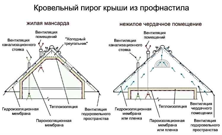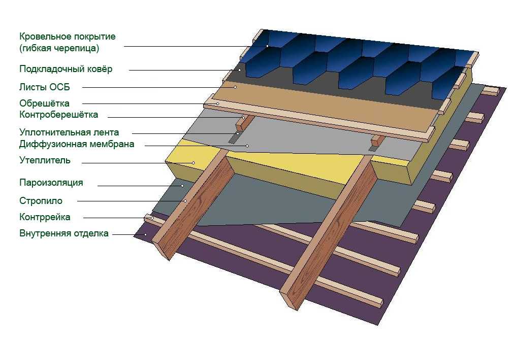 Мансардная крыша устроена намного сложнее, поэтому начнём с неё. Это многослойная конструкция, её так и называют – «пирог». В «пироге» предусмотрены такие слои: