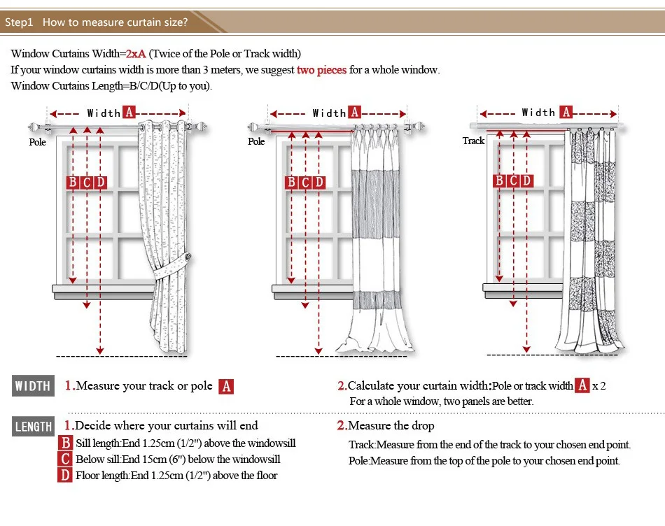 Например, если ширина вашего окна составляет около 100 дюймов, ширина штор должна быть от 200 до 250 дюймов.