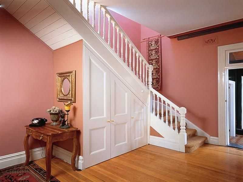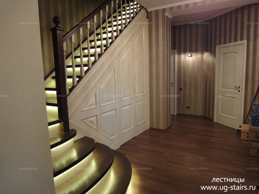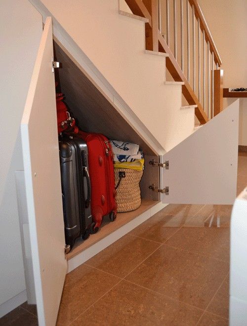 Такой вариант хранения вещей — мечта каждой хозяйки.Если расположение лестницы не позволяет сделать вход, то традиционный вариант со встроенными шкафами под лестницей, также вполне практичен.Как разместить шкаф под лестницей.