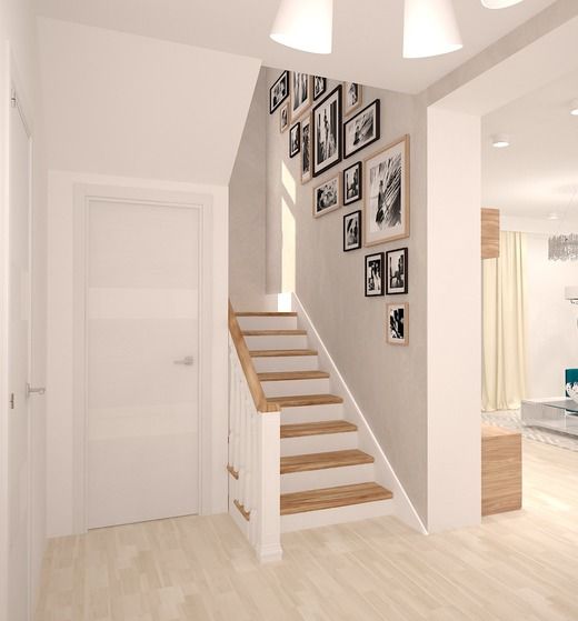 Очень удобно использовать пространство под лестницей как часть прихожей. Место для хранения вещей может быть в верхней высокой части лестницы- в шкафу с зеркальной дверцей.