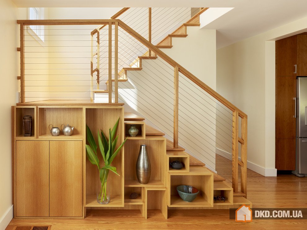 Все это нужно где-то хранить, и почему-то бы не оборудовать специальную зону под лестничным маршем? Удобно, если лестница находится недалеко от входа.