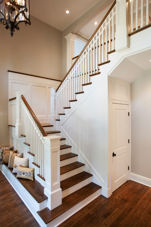 Такой вариант хранения вещей — мечта каждой хозяйки.Если расположение лестницы не позволяет сделать вход, то традиционный вариант со встроенными шкафами под лестницей, также вполне практичен.
