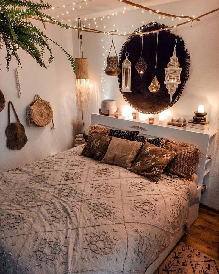 Струнные светильники, безусловно, являются типичным элементом освещения в стиле бохо. Вы можете повесить их над изголовьем, над картинами, повесить вокруг растений, вокруг зеркала… Струнные светильники можно разместить где угодно и они будут выглядеть великолепно.