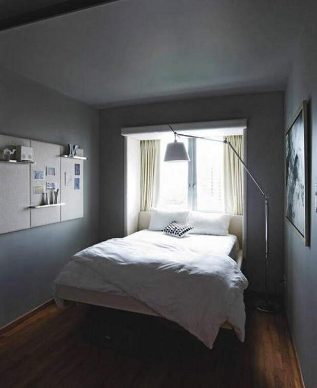 Несмотря на то, что во многих случаях не рекомендуется ставить кровать напротив окна, для маленьких комнат это решение единственное.