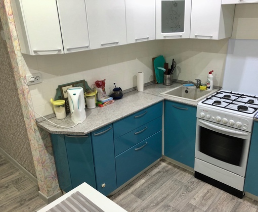 - Островное расположение мебели (с наличием «островка» из рабочих поверхностей посередине) в кухне «хрущёвки» невозможно.