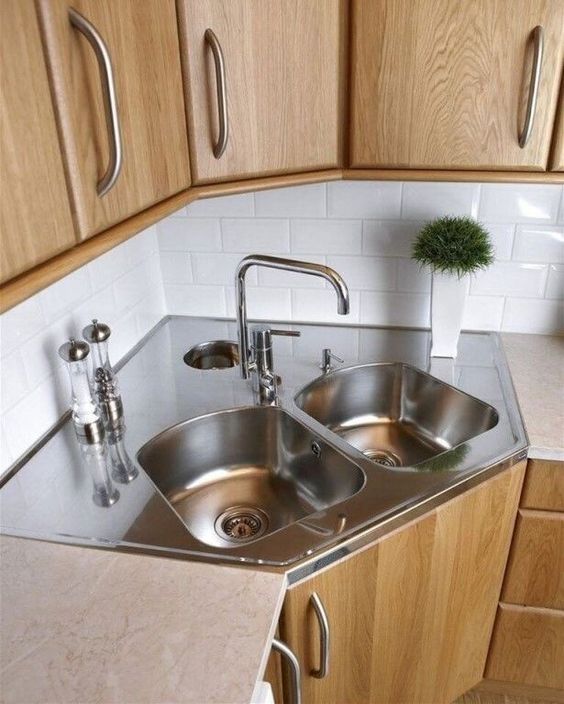 Главное помнить, что обыкновенные мойки для «прямых» одностенных кухонь никак не могут подойти, ведь они ориентированы перпендикулярно стене, а значит если поставить такую раковину в угол кухни у вам будет крайне неудобно ее использовать.