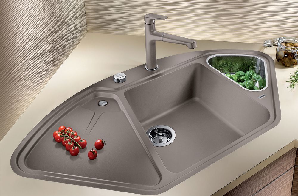 Для моек в угловых кухнях место практически всегда предопределено: это стык между двумя стенами, то есть непосредственно угол. Выбор таких моек велик, так что проблем на счет выбора возникнуть не должно. Угловые раковины, как правило, значительно больше прочих, что очень удобно для больших семей.