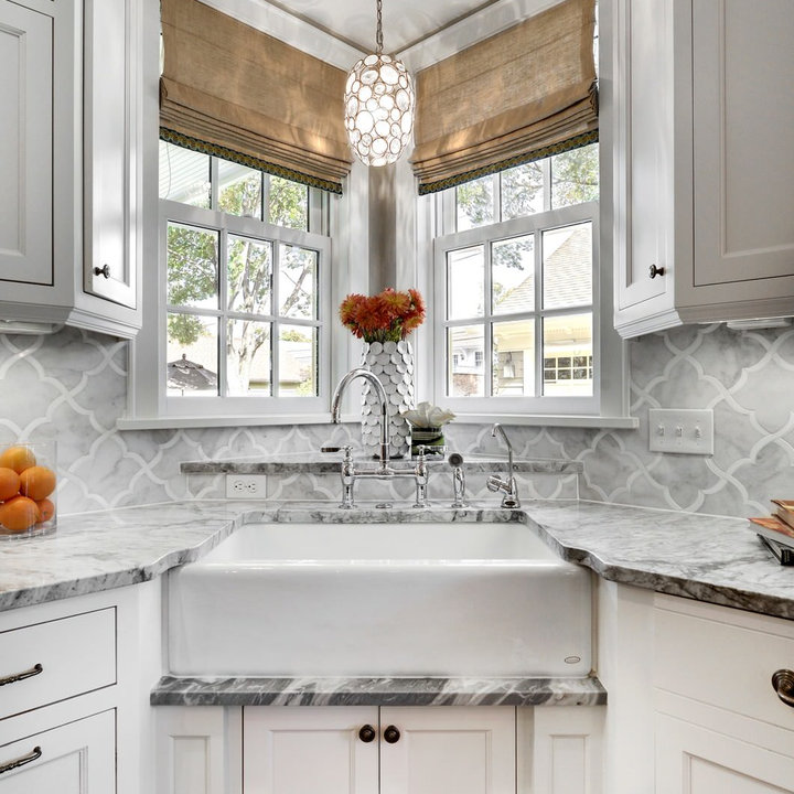 Эта традиционная Г-образная кухня предлагает шкафы из бисера с красивым островом из каррарского мрамора и светлым деревянным полом.