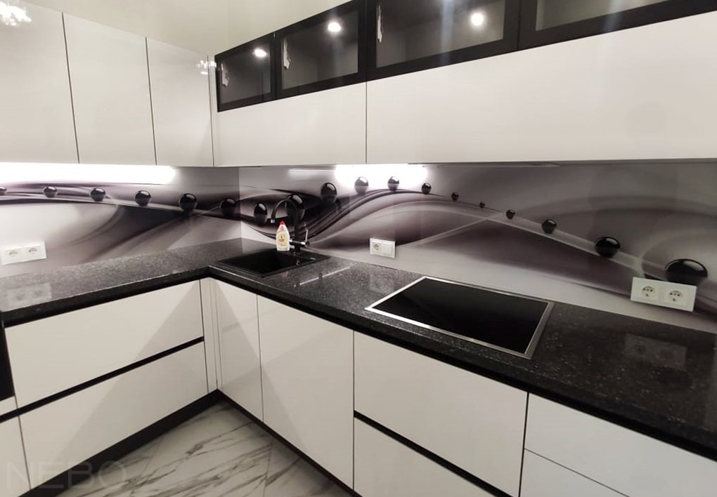 Творческий дизайн кухни с использованием изогнутых шкафов, отделанных глянцевым белым ламинатом. Эта кухня имеет футуристическую привлекательность, особенно благодаря использованию выпуклых верхних шкафов. Для своей столешницы он использует простую и однотонную серую сплошную поверхность и сочетается с черной мозаичной плиткой для фартука.