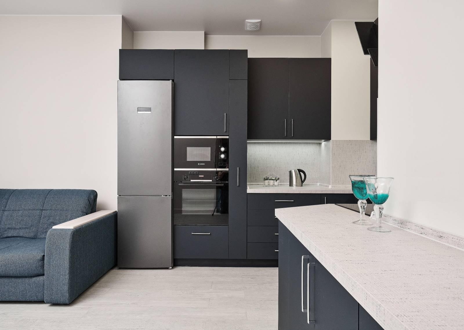 Такие кухни чаше всего исполняются в П-образной форме, где две соседние стены отведены непосредственно под кухню, а барная стойка занимает третью стену или образует ее. Такая конфигурация великолепно подойдет для квартир студий с одним или двумя жителями, так как барную стойку можно использовать в качестве обеденного стола, что сэкономит место в оставшейся части квартиры.