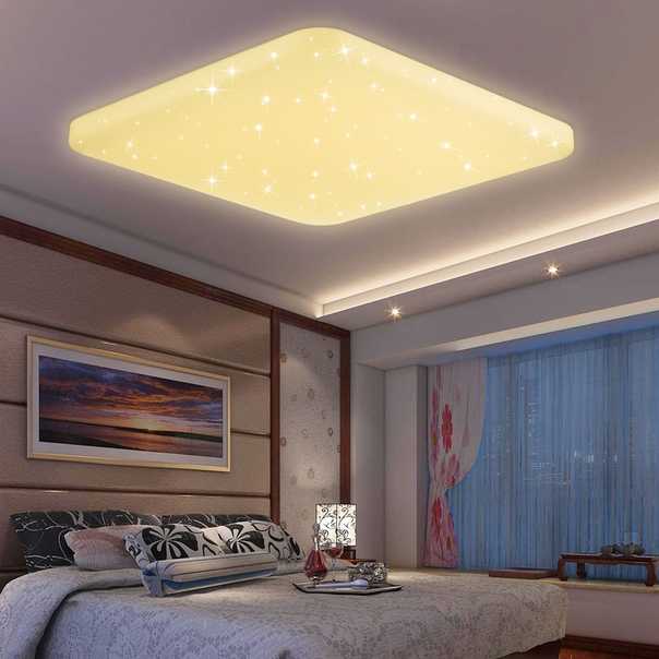 Спальня. Нет необходимости в ярком свете, чаще используют круглое точечное освещение или овальное. Потолочные светильники также располагаются в геометрическом порядке и в виде произвольного узора.