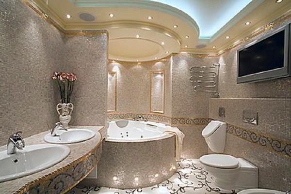 Интересно смотрится потолочная хрустальная люстра. Особенно в том случае, если сама ванная стилизована под старину. Смотрится такой светильник шикарно, а его мелкие декоративные детали поблескивают на свету. Но изделия из хрусталя достаточно массивные. Так что если в ванной натяжной или подвесной потолок, то такой вариант вам не подойдет. А еще стоит помнить о том, что