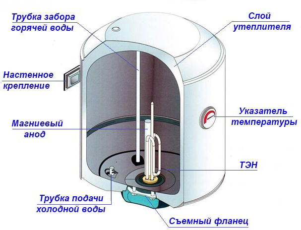 Если вода из бака не расходуется, то с помощью автоматики водонагреватель поддерживает ее температуру, заданную пользователем. В процессе нагревательный элемент то включается, то выключается. Такая функция не расходует большого количества электроэнергии, всего несколько кВт в сутки. Поскольку стенки бака имеют теплоизоляционный слой, потеря тепла происходит очень медленно: за час вода остывает на 1-2 градуса.