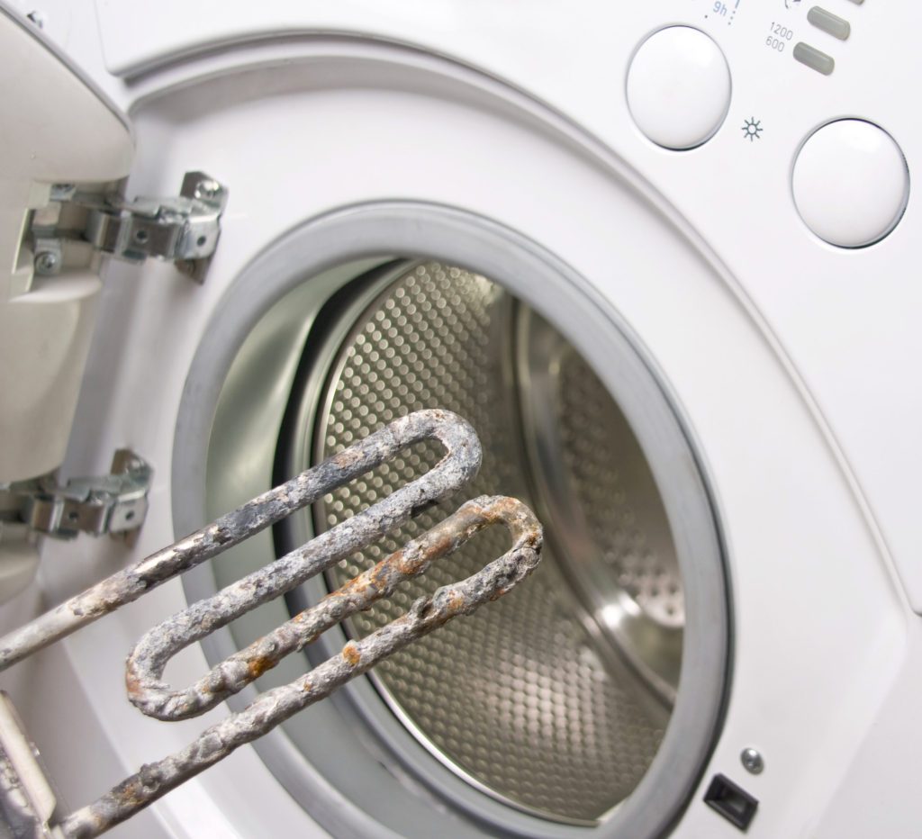 Отложения солей металлов будут везде в стиральной машине, например в каналах подачи воды, в КЭНах (клапан подачи воды). Но сильнее всего от накипи страдает ТЭН стиральной машины. Если вода жесткая и ничего не предпринимать, то через несколько лет ТЭН покроется коркой накипи и тут возможны следующие проблемы: